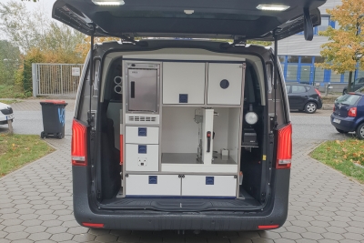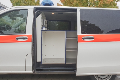 Rüstsatz Einsatzleitfahrzeug mit Digitalfunk und FMS Leittechnik sowie GSM Telefon. Im Fond verbaut wurde bei dieser Fahrzeuglösung ein Schreibtisch. Hier verfügt das Fahrzeug über eine zweite Funkstelle damit hier z.B. ein LNA „Leitende Notarzt“ oder ein Orgl. „Organisationsleiter Rettungsdienst“ arbeiten kann. Hierfür verfügt das Fahrzeug auch über eine permanente 220 V Versorgung auch während der Fahrt.